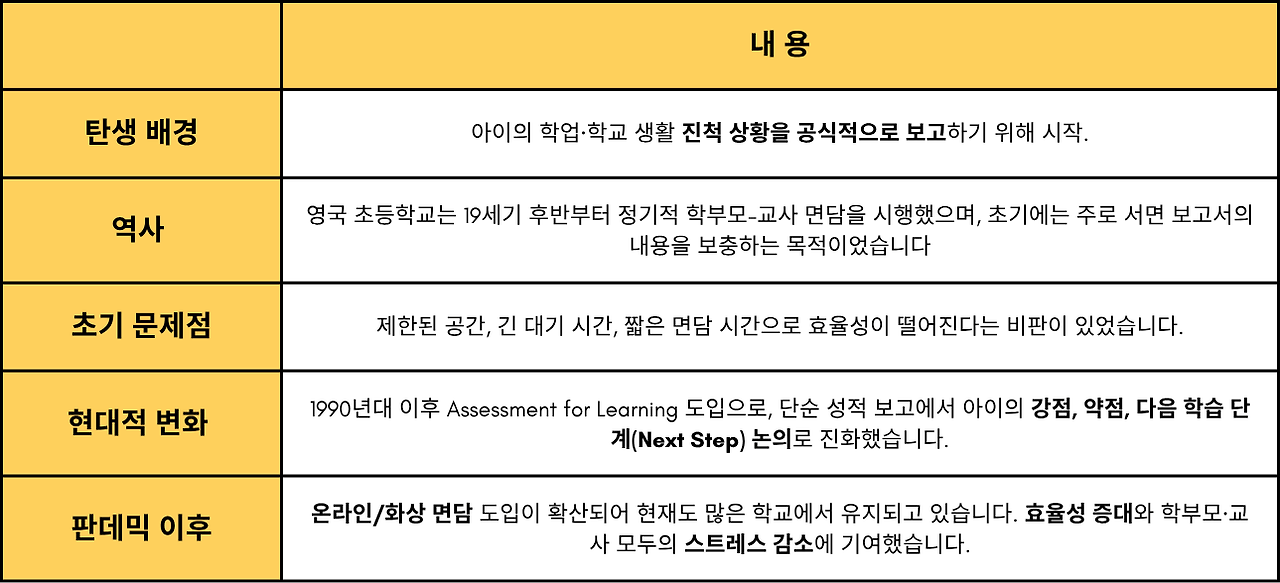 Parents’ Evening은 아이의 교육을 학교와 가정이 함께 지원하기 위해 오랜 기간 진화해 온 영국의 교육 전통입니다.