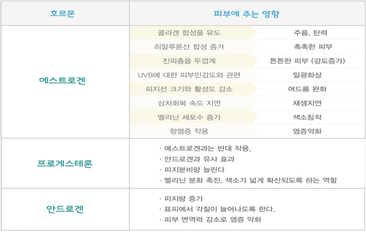 위의 현상이 에스트로겐 혈중 농도가 줄고 프로게스테론 농도가 늘어나기 때문에 생기는 피부 반응입니다. 각 성호르몬이 아래와 같이 작용하기 때문이지요.