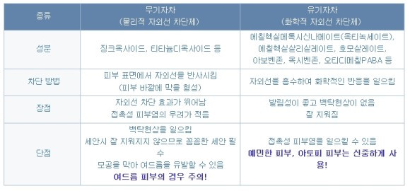 물리적 자외선 차단제의 경우에는 징크옥사이드, 산화아연이나 이산화티탄과 같은 광물성 물질로 피부 바깥에 막을 형성하는 방식을 이용하기 때문에 자외선 차단 효과가 뛰어나고 접촉성 피부염 등과 같이 썬크림에서 빈번히 생기는 부작용이 적게 발생한다는 아주 중요한 장점이 있지요. 그래서 연약한 어린아이들의 피부나 아토피 피부라면 유기자차 선크림을 사용하셔야 합니다. 그러나 무기자차 썬크림의 경우 불투명한 자외선 차단 성분들이 피부 바깥에 막을 형성해 바르면 하얗게 보이는 백탁현상이 생깁니다. 선크림 바른 뒤 하얗게 떠서 피부와 따로 노는 밀착감과 발림성이 떨어지는 제품은 무기자차인 물리적 자외선 차단제라고 생각하시면 된답니다.