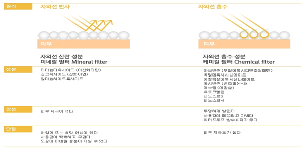 자외선차단제(선크림)는 자외선을 어떤 방법으로 차단하느냐에 따라 물리적 자외선 차단제인 무기자차와 화학적 자외선 차단제인 유기자차로 구분이 됩니다. 무기자차는 피부 표면에서 자외선을 산란, 반사시키는 무기 물질을 이용해 자외선을 차단하고, 유기자차는 피부 표면의 자외선을 흡수해 열에너지로 분산시키는 화학 반응으로 자외선을 차단해줍니다.