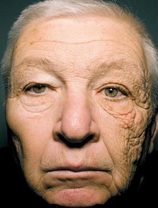바로 66세의 나이의 월리엄 맥앨리곳이라는 사람입니다. 위 사진은 합성이나 조작된 사진이 아닙니다. 월리엄은 좌우 얼굴 노화 정도가 달라 오른쪽 얼굴 나이는 66세, 왼쪽의 얼굴 나이는 86세라고 합니다.그리고 이 분은 병원에서 광노화에 의한 일사성 피부염으로 진단을 받았습니다. 즉 자외선에 의한 광노화로 한쪽 얼굴만 너무 빨리 늙어버려 양쪽 얼굴의 차이가 커져버린거지요. 왜 이 사람에게 이런 일이 일어났을까요? 운전기사가 직업인 그는 시카고에서 28년간 낮시간에 상점과 주유소에 우유를 배달하는 일을 해 왔습니다. 그의 트럭에는 에어컨이 없었기 때문에 늘상 운전석 창문을 열어놓고 다녔다고 하는데요. 28년간 지속된 그의 운전 습관이 아수라 백작과 같은 그의 얼굴을 만들었습니다. 월리엄 맥앨리곳 씨는 피부를 태양으로부터 보호해야한다는 교훈을 주는 산증인입니다.