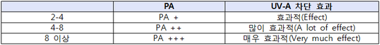 위의 표와 같이 3개의 범주로 나눠지는데요. PA+만 되어도 자외선 A의 차단 정도는 효과적이라고 볼 수 있답니다. 그러니 SPF 수치가 높은 것, PA의 +개수가 많은 것을 고집할 필요가 없습니다. 오히려 지수가 과도하게 높은 제품들은 피부에 자극을 줄 수 있는 자외선 차단 성분들이 많다는 의미이기 때문에 장시간 사용하는 것은 추천드리지 않습니다.