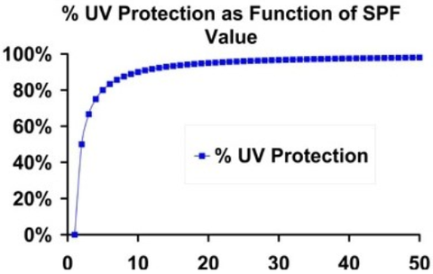 이 그래프는 SPF의 수치에 따라 자외선이 차단되는 정도를 나타냅니다. 보시다시피 SPF가 일정지수에 다다르면 자외선 B를 차단되는 정도의 차이는 미미해집니다. 즉, SPF가 15이상만 된다면 일상생활에서 자외선은 충분히 차단된다는 의미이지요.