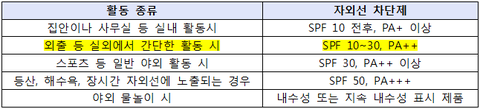 위의 표는 식품의약품안전평가원에서 발표한 자외선 차단제 선택 기준인데요. 야외 활동 정도에 따라 적합한 지수의 자외선 차단제를 고르는데 참고하시면 좋겠습니다.