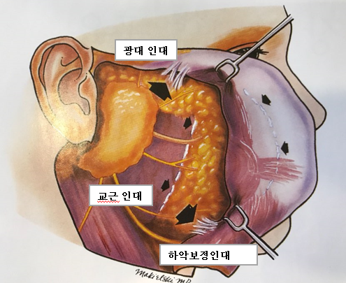 이를 위해 얼굴 연부조직 아래 붙어있는 보정인대와 얼굴 피하의 지방패드의 해부학적 구조를 이해하는 것이 필요합니다. 얼굴 근육은 서로 유기적으로 연결이 되어 있고 얼굴 피부와도 여러 결합조직과 SMAS(표층근건막)를 통해 연결이 되어 있습니다. 이 SMAS층은 얼굴 근육과 연결이 되어 다양한 얼굴 표정을 짓는데, 중요한 역할을 하지요.