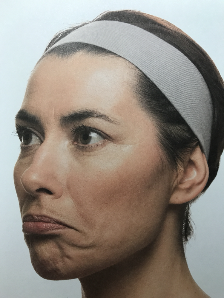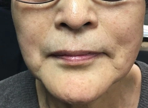 위의 여성은 60대 중반의 여성인데요. 노화 현상으로 인해 탄력이 떨어지면서 골막보정인대 근처로 전형적인 마리오네트 주름라인과 심술보인 Jowl이 형성하고 있는 모습을 볼 수 있습니다.