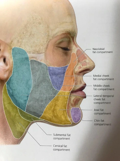 지방패드는 얼굴 피부를 벗겨내면 그 아래 얇은 층으로 형성되어 있는데요. 이 지방패드는 젊었을 때는 섬유성 격막이나 보정인대 등의 조직에 의해 제 위치에서 잘 유지가 되다가 나이가 들면서 중력의 영향을 받아 아래로 처지게 됩니다. 위의 사진에서 jowl fat compartment가 바로 심술보를 만드는 지방패드 영역입니다.
