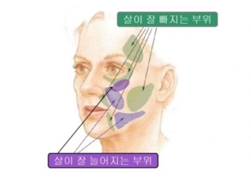 얼굴을 보면 지방이 잘 꺼져서 살이 빠져보이는 부위와 살이 잘 늘어나서 처지는 부위가 위의 그림처럼 나눠집니다. 이러한 현상은 결국 얼굴이 가진 보정인대와 지방패드의 영역과 얼굴 근육의 움직임과 관계가 있는 것입니다.