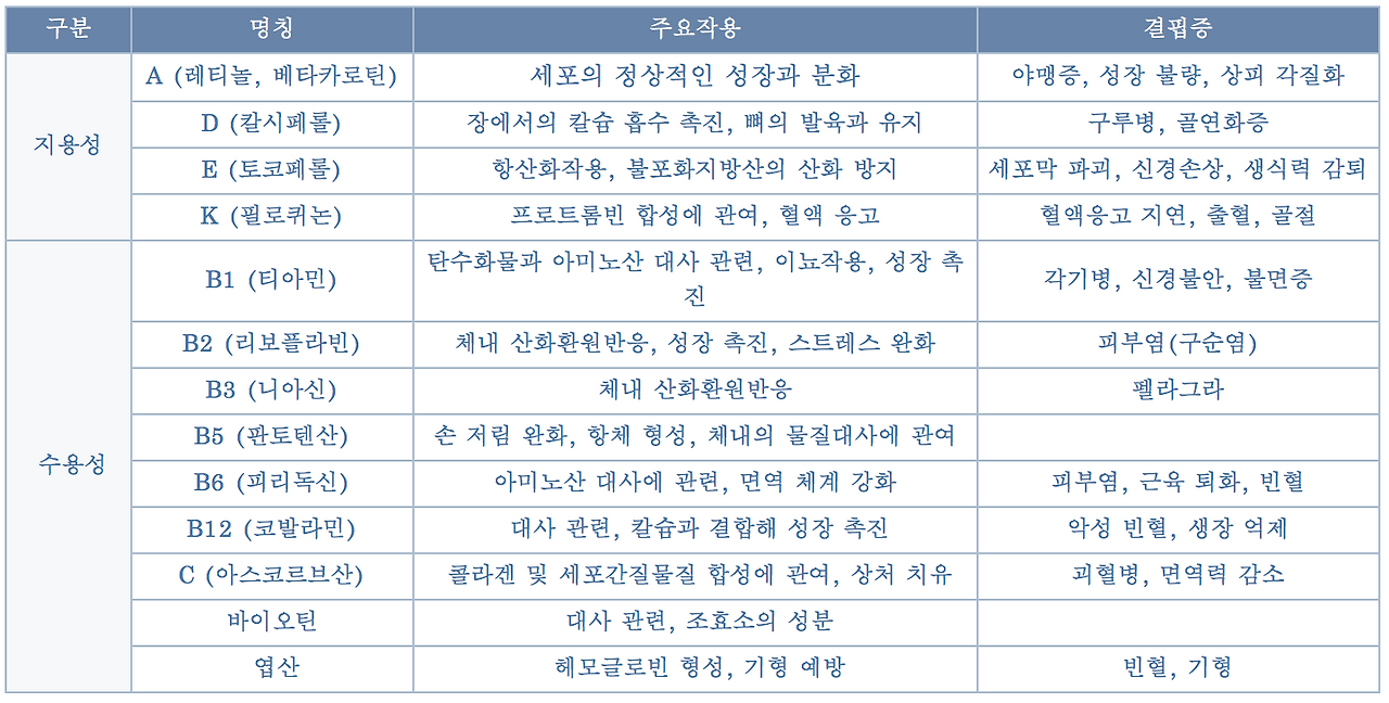 아래의 표와 같이 비타민은 다양한 종류가 있고, 각각이 다른 역할을 한답니다.