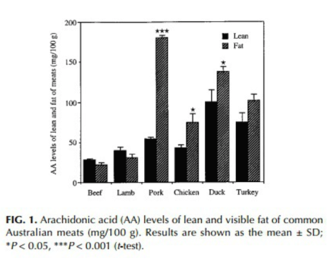 그러면 여드름이 있는 사람은 육류는 마음껏 못먹는걸까요? 고기 좋아하시는 분들은 너무 속상할 거 같은데요. 호주의 멜번대학교에서 이에 대해 연구를 진행한 논문이 있습니다. 결론은 돼지 고기 또는 가금류(닭, 칠면조 등) 고기에서 지방을 많이 먹는 경우 아라키돈산의 섭취가 증가할 수 있다는 것이죠. 즉 아라키돈산을 적게 먹기 위해서는 가급적 소고기, 양고기, 혹은 기름을 뗀 돼지고기나 닭고기를 섭취하는 것이 좋을 것으로 생각됩니다. 그래프로 보면 아래와 같습니다.