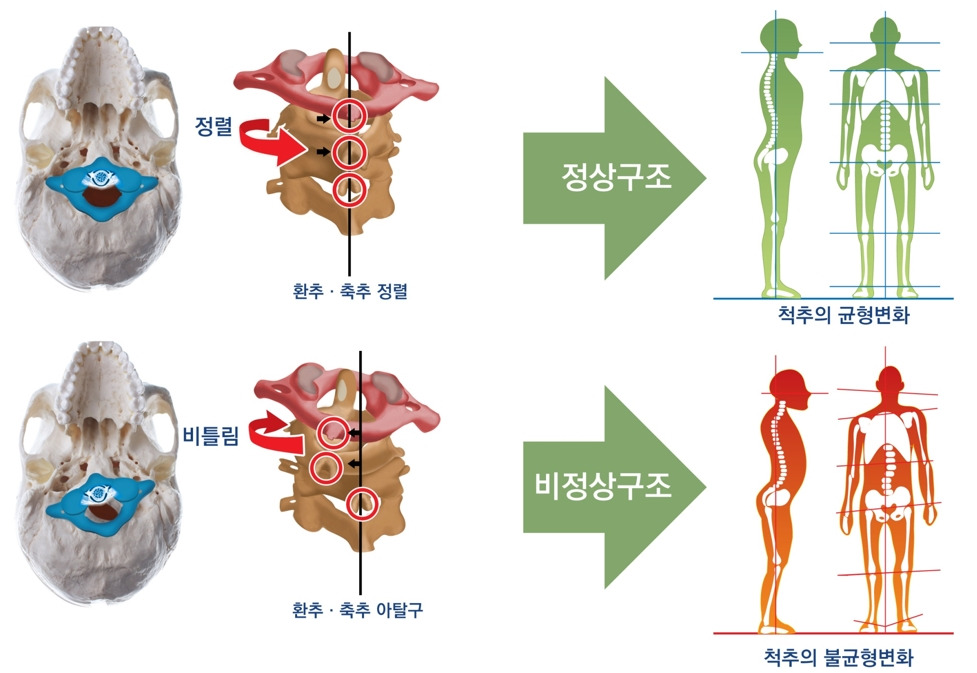 인체는 유기적으로 구성되어 있습니다. 그래서 한곳이 틀어지면 다른 부위에도 유기적으로 영향을 주게 됩니다. 성인 머리의 무게는 약 4.5에서 6kg정도로 볼링공 무게와 비슷합니다. 척추는 26개의 뼈가 블럭처럼 머리를 떠받치면서 차곡차곡 쌓여 있지요. 머리를 최전선에서 받치고 있는 경추는 모두 7개의 뼈로 되어 있는데 특히 경추 1번과 경추 2번은 아래턱이 움직일 때 운동의 중심축이 됩니다. 또한 목운동의 50% 이상을 담당하고 있어 척추 전체 구조중 경추 1번과 경추 2번이 가장 중요합니다.
