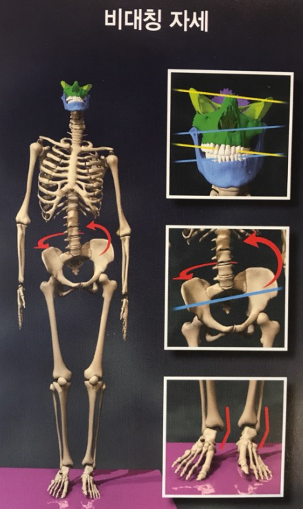 우선 수평이 무너지면서 좌우로 틀어지면 위의 사진처럼 턱관절이 한쪽으로 틀어지게 되고 아래턱의 무게가 턱관절이 틀어진 쪽으로 쏠리면 두개골의 무게도 중심을 따라 이동합니다. 머리의 무게 중심이 한쪽으로 쏠리게 되면 머리를 받치고 있던 경추가 몸의 균형을 잡기 위해 머리의 반대 방향으로 기울어지고 어깨와 수직을 이루고 있는 목때문에 경추가 기울어지게 되면 반대쪽 어깨가 올라가게 되지요. 경추의 틀어짐은 도미노처럼 흉추에서 요추까지 틀어지게 해서 결국 골반까지도 틀어지게 되고 골반이 틀어지면 한쪽 발도 외회전되고 양쪽 다리의 길이가 달라지게 됩니다.