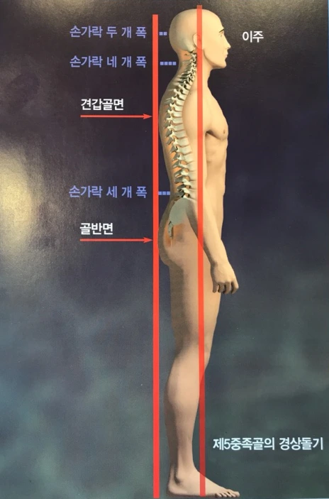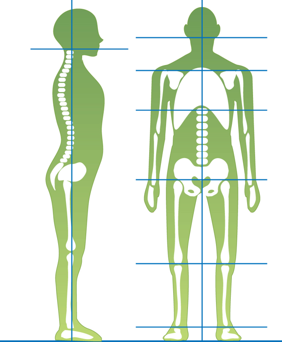 정면에서 보았을 때는 교합평면과 안와평면, 어깨선 평면, 골반선 평면이 지평선과 평행을 이루고 머리의 중심과 양발의 중심을 지나는 정중선 상에 척추의 중심이 위치하면 됩니다. 아래 사진을 참고해 보시면 되겠습니다.