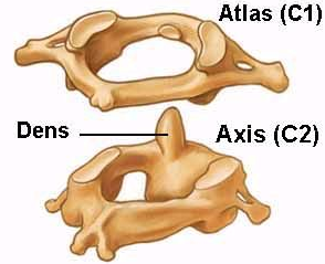 머리 바로 밑에 있는 제 1경추는 돌아가는 척추뼈라는 뜻을 가진 환추라고 불리고 영어로는 Atals라고 합니다. 그리스 신화에서 천계를 어지럽힌 죄로 제우스로부터 평생 지구를 어깨에 짊어지는 형벌을 받았던 거인신 이름에서 유래되었는데요. 환추에는 두개골을 안정적으로 받칠 수 있도록 2개의 관절와가 있어서 평생 무거운 머리를 떠받치는 일이 가능해집니다. 제 2 경추는 턱관절의 움직임과 목운동의 축이 된다고 해 축추라고 불리우는데요. 영어로는 Axis입니다. 환추와 축추 사이에는 연골 원판인 디스크가 없고 축추의 치돌기는 환추의 치돌기와 호크 단추처럼 끼워져 있어서 외견상 1개의 목뼈처럼 움직입니다. 이 치돌기(dens)는 목운동의 회전축일뿐 아니라 턱관절 운동의 중심축 역할을 하므로 턱관절 위치가 변하게 되면 환추와 축추의 위치도 바뀌게 되고 반대로 환추와 축추의 위치가 변하면 턱관절의 위치도 어긋나게 되는 것이지요.