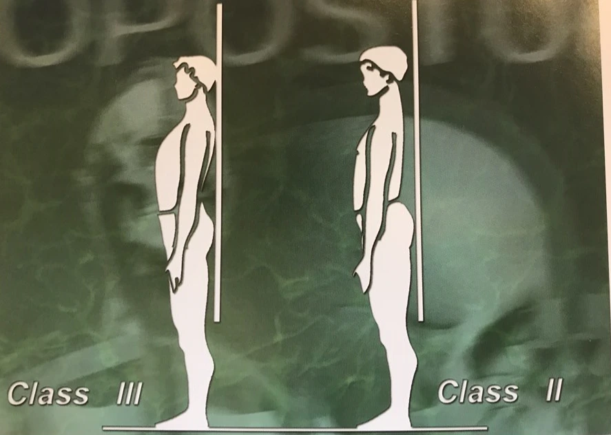 하악의 전후 이동으로 인한 교합의 변화는 치아의 변화에 그치지 않고 얼굴 모양의 변형을 만들어내고 자세의 변화의 원인이 되기도 합니다. 아래 그림처럼 class 3의 교합은 머리의 중심이 뒤로 밀리고 class 2 교합은 머리의 중심의 앞으로 밀려 목을 쭉 빼는 자세를 보상적으로 취하게 됩니다.