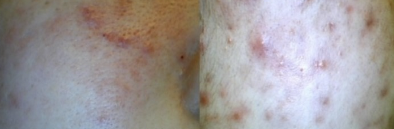 보통 모낭염은 피부과에서 항생제로 치료하는데요. 그러나 재발 경향이 강하고 만성화되는 경우에는 치료해도 호전반응이 잘 나타나지 않습니다. 여드름과 감별은 압출해보면 피지가 관찰되지 않고 표재성 즉 여드름보다 깊지 않은 병변 위치로 구별하게 됩니다. 만성화된 모낭염의 경우에는 한약치료가 중요합니다.