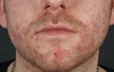 모낭염은 감염이나 화학적 자극 또는 물리적 손상에 의해 나타나는 모낭의 염증을 말합니다. 오른쪽 사진과 같은 포도구균성 모낭염은 가장 흔한 형태의 감염성 모낭염이으로 찰과상과 물리적인 손상에 의해 발생하는 경우가 많습니다. 콧구멍은 황색포도구균의 저장소로서, 안면부에서는 코 근처의 피부에 모낭염이 잘 생기는 것으로 알려져 있습니다. 왼쪽 사진처럼 남자의 수염부위에 발생하는 모낭염을 특징적으로 모창이라고 구별해서 부르기도 합니다. 면도하는 과정에 악화되기 쉬워요. 특히 안면부에 발생하는 황색포도구균의 군집에 의한 모낭염은 여드름으로 오인되기도 하는데요.