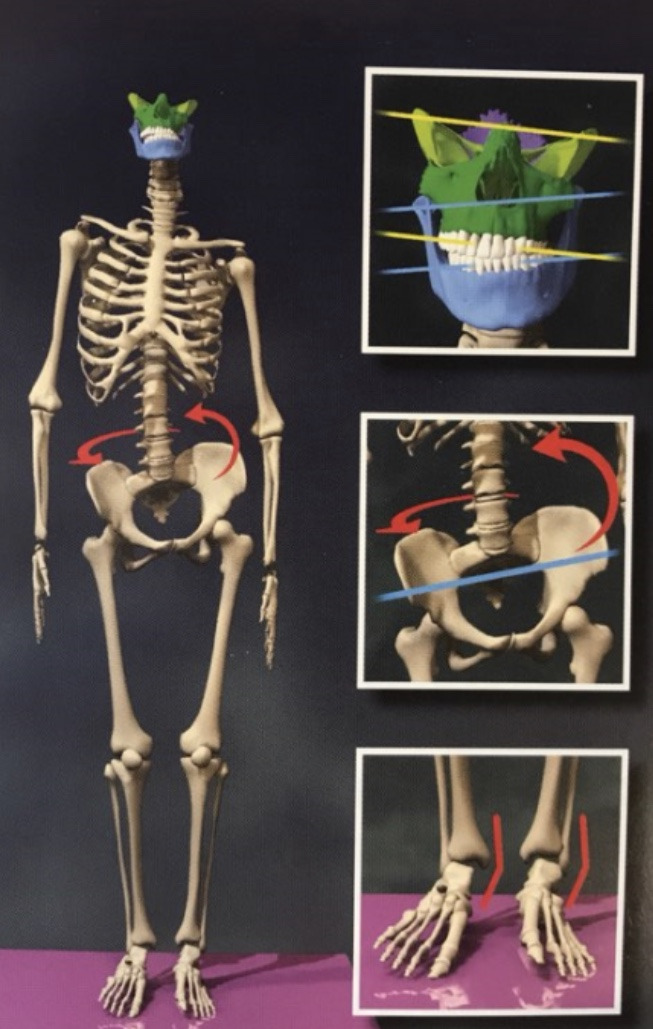 상하악 치아의 교합면이 이루는 가상평면을 교합평면이라고 하는데 전후 좌우 치아가 같은 평면상에 있는 것이 정상입니다. 교합 평면의 수평이 무너지면서 좌우로 틀어지면 위의 사진처럼 턱관절이 한쪽으로 틀어지게 되고 아래턱의 무게가 턱관절이 틀어진 쪽으로 쏠리면 두개골의 무게도 중심을 따라 이동합니다. 머리의 무게 중심이 한쪽으로 쏠리게 되면 머리를 받치고 있던 경추가 몸의 균형을 잡기 위해 머리의 반대 방향으로 기울어지고 어깨와 수직을 이루고 있는 목때문에 경추가 기울어지게 되면 반대쪽 어깨가 올라가게 되지요. 경추의 틀어짐은 도미노처럼 흉추에서 요추까지 틀어지게 해서 결국 골반까지도 틀어지게 되고 골반이 틀어지면 한쪽 발도 외회전되고 양쪽 다리의 길이가 달라지는 과정을 거치면서 전신 불균형으로 이어집니다.