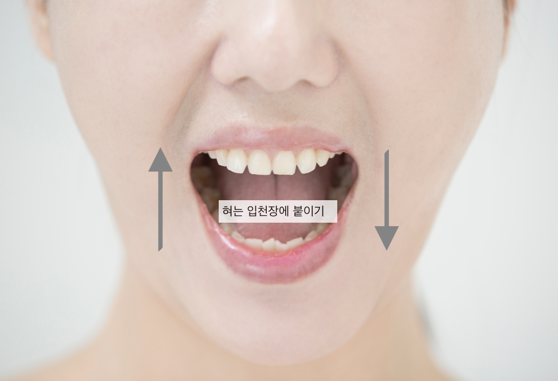 턱관절 이완에 좋은 두번째 운동법은 바로 혀돌리기인데요. 혀돌리기를 하기 전 혀의 앞부분 1/3 지점에 혀가 닿도록 한 다음 입천장 앞쪽에 대고 딱 소리를 반복해서 냅니다. 이때 중요한 포인트가 혀가 치아에는 닿으면 안됩니다. 바로 가장 안정적인 혀의 위치로 평소에도 이 위치를 유지하도록 노력해야 합니다.