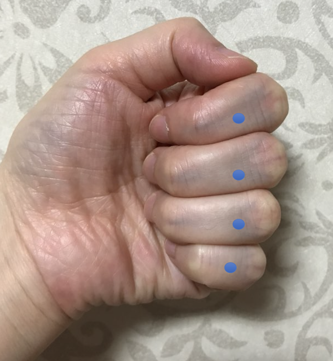 양손을 주먹 쥐고 손가락 중절을 이용해 귀 뒤쪽에서 앞으로 위 그림의 선처럼 포물선을 그리면서 꾹꾹 눌리면서 풀어주세요. 굳어서 더 아픈 곳에서는 잠깐 움직임을 멈추고 꾹 누른 다음 이완되면서 풀리는 것을 기다린 다음 뒤에 양 손을 앞으로 이동하면서 풀어주시면 됩니다. 그리고 조금 내려와 같은 방식으로 반복하시면 됩니다. 한번에 3번 정도 진행하시면 됩니다.