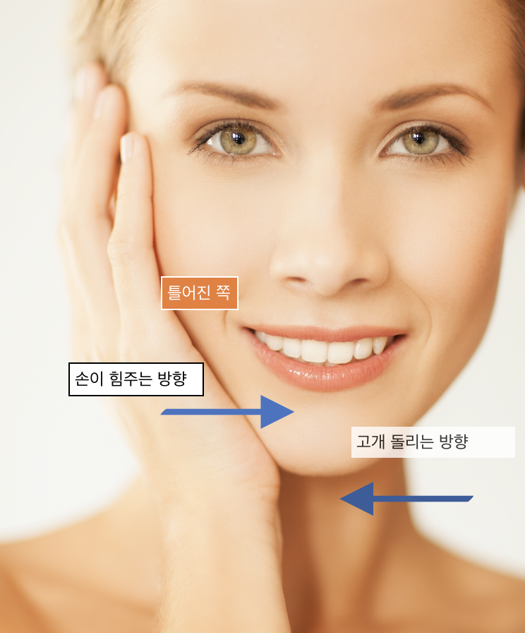 턱이 한쪽으로 틀어지면서 안면비대칭이 생겼을 때 틀어진 쪽의 경직된 교근과 내익상근, 외익상근을 교정해주는 동작입니다. 이 동작을 할 때는 중요한 것이 사진의 모델처럼 이쁘게 웃기보다는 '아'하는 느낌으로 아래턱의 힘을 빼는 것이 중요합니다. 그런 다음 턱이 틀어진 쪽에 손바닥을 대고 어제부를 하악각에 밀착시킨 다음 반대쪽으로 턱을 밀어주면서 고개는 틀어진 쪽으로 돌려줍니다. 이 동작을 5회 반복합니다.