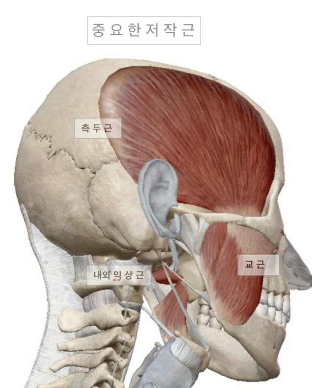 안면비대칭과 턱관절 장애는 안면부 근육, 특히 저작근의 역학관계가 깨지면서 심화됩니다. 이와 관련된 근육에 대해서는 제가 정리했던 글이 있으니 함께 참고해주시면 좋을 거 같습니다.