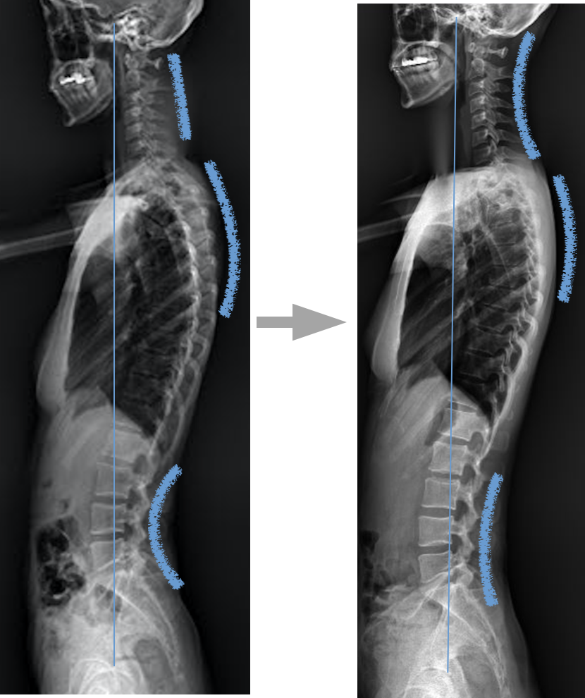 척추 만곡에도 변화가 생기는데요. 이 또한 엑스레이 사진에서 변화를 확인할 수 있습니다.