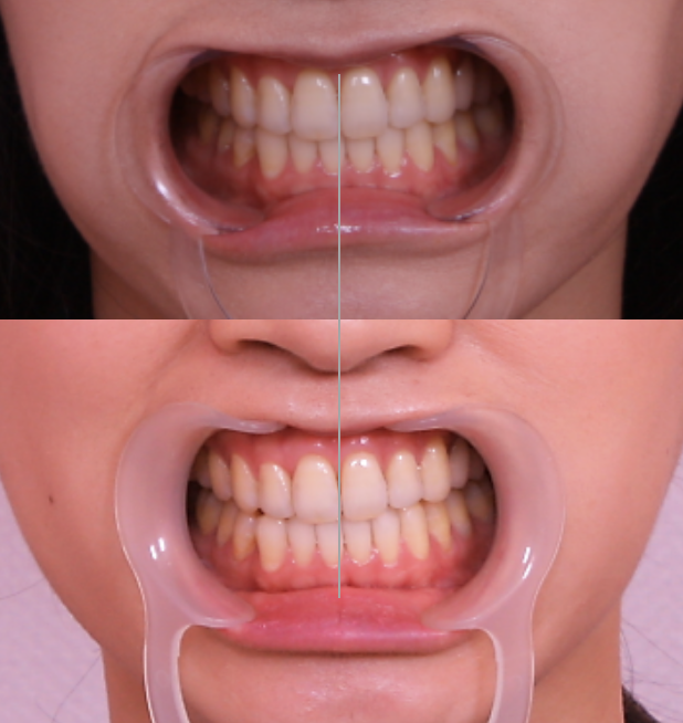 치아 교정을 하지 않았음에도 치료전 치아와 치료후 치아 상태를 비교했을 때 치과적인 영역에서도 의미있는 변화가 생깁니다. 대문니의 중심선의 틀어짐이 관찰되는데요. 즉 아래 치아의 중심선이 약간 왼쪽으로 이동해 있고 윗니가 아랫니를 많이 덮고 있는 교합 패턴이 치료전 치아입니다.