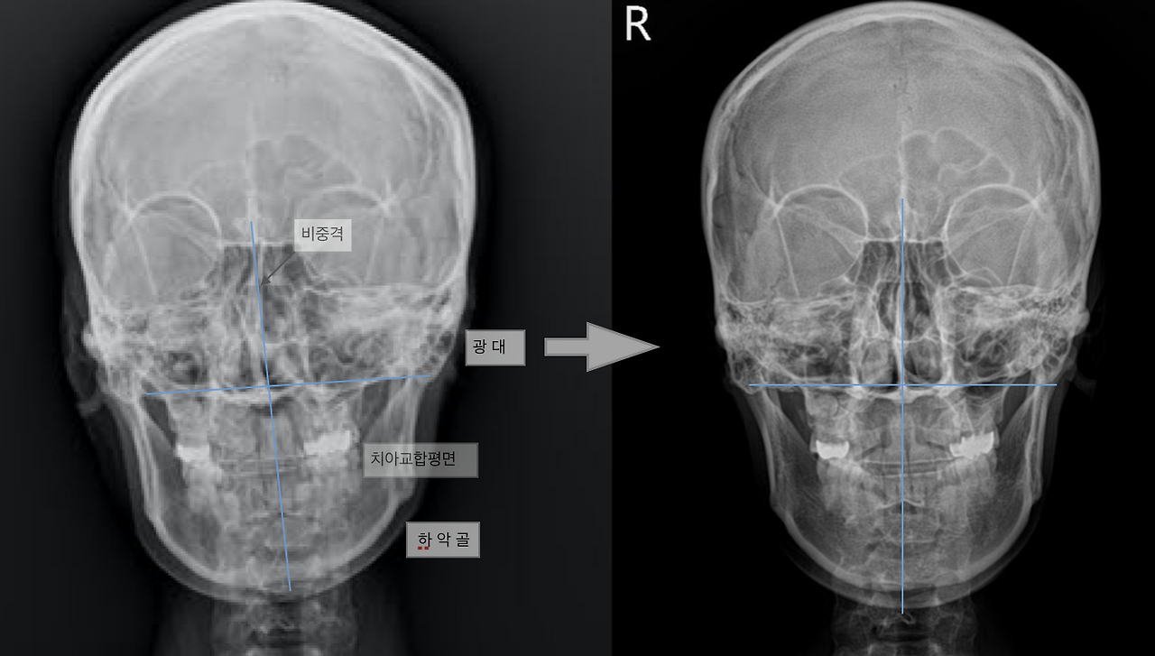 제가 얼굴비대칭을 교정하기 위해 하는 일은 안면골, 특히 턱관절과 경추 그리고 몸의 상대적인 위치관계를 개선시키는 것입니다. 그런데 안면비대칭으로 교정되는 변화는 단순히 피부 영역이나 근육 영역에서만 일어나지 않습니다. 실제로 근육 길이가 조절되면서 안면골 즉 뼈의 위치까지 변화가 나타납니다. 위 환자의 엑스레이 사진인데요. 왼쪽의 치료전 사진은 아래턱과 광대 위치를 포함한 안면골이 오른쪽으로 치우쳐 있는 양상을 볼 수 있습니다. 그런데 교정 치료가 끝나고 나서 찍은 엑스레이 영상에서는 여러 영역의 안면골의 영상에서 변화가 생겼습니다.