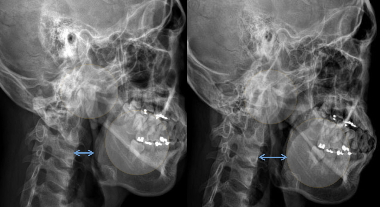이 엑스레이 영상에서는 뒤로 밀려있던 턱이 앞으로 이동하면서 airway의 직경이 개선되는 것을 확인해볼 수 있습니다.