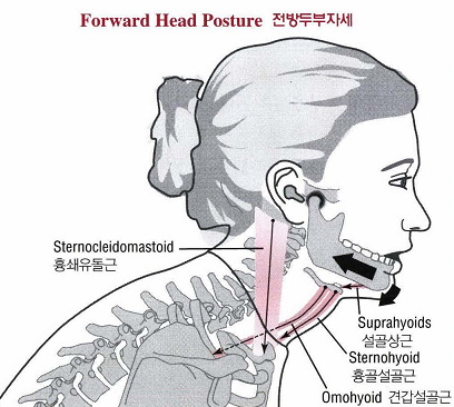 이러한 자세는 하악골을 뒤로 더 당기게 되며 설골 주변 근육을 과긴장하게 만들 수도 있으며 턱관절을 중심으로 아래턱과 목에서 형성되는 근육의 역학의 균형을 깨트리는 원인이 될 수 있어서 2차적으로 여러가지 문제를 만들 수 있는 것입니다.