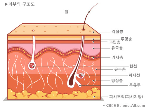 피부는 표피, 진피, 피하지방층으로 구성되고,