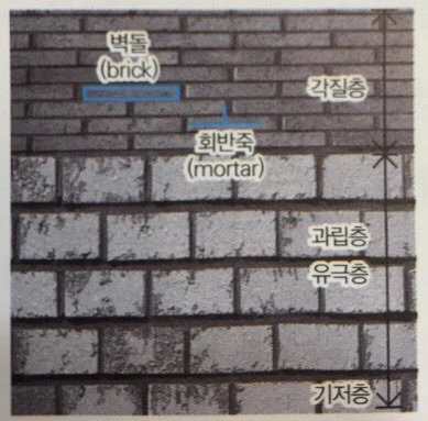 이게 참 재미있는 것이 각질층의 모습을 담장을 보면서 집을 지을 때 사용하는 벽돌 (각질형성세포)와 회반죽( 각질세포간 지질, 라멜라)로 설명을 했다는거에요.
