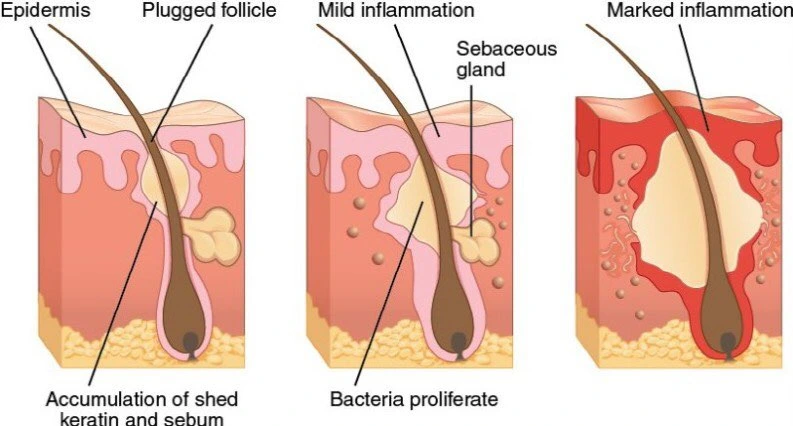 각질 탈락되는 속도가 지연되면서 이 각질이 모공벽을 막으면서 피지가 모낭내 정체되면서 생기는 것이 바로 여드름 면포이고 염증이 진행되는 것이 바로 여드름입니다.