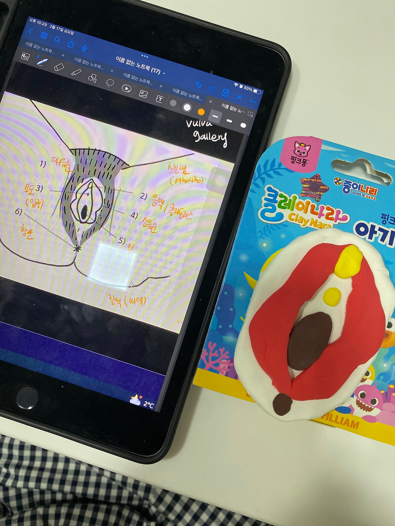 두 번째 시간은 ‘성 마주하기’ 시간이었다. 여성의 생식기를 들여다보고 각각의 이름과 기능들을 알아보았는데, 놀랍도록 아는 것이 적은 나를 발견했다. 미리 배송받은 아기 상어 클레이로 우리는 각자의 생식기를 만들어보았다. 그리고 “클레이 사장님은 아기 상어 클레이가 이렇게 쓰이실 줄은 꿈에도 모르시겠죠.”라고 웃으며 ‘생식기 토크’를 나누었다. 여기에 적지는 못하지만, 한 분께서 ‘이건 아무한테도 해본 적 없는 이야기인데요..’라며 나눠준 이야기에 나머지 사람들은 처음에는 충격을, 나중에는 웃음을 터트렸다.
