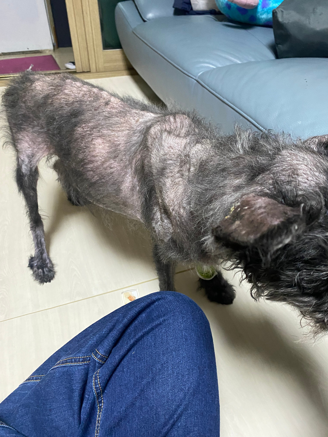 애정이를 보러 자주 오겠다던 나의 다짐은 핑계를 대자면 현생에 치여, 조금 더 솔직하게 말하자면 혼자만의 시간이주는 따뜻함에 취해 많으면 일주일에 두 번, 대부분의 경우 일주일에 한 번씩 짧은 시간 애정이를 보러 가고 산책을 시켜주러 가는 게 전부였다. 다른가족들이 잘 보살펴주고 있다는 안도감이었다. 그동안 애정이의 상태는 일주일이 다르게 나빠졌다. 약 부작용으로 배 근육이 사라지면서 둥근 배는 쳐지고, 다리 근육에도 힘이 없어지면서 다시 걷는 게 힘들어졌다. 목줄이 아닌 몸에 밴드를 착용하여 겨우 대소변을 해결하고 들어와야 했다. 그 마저도 항문에까지 염증이 생겨서 대변도 힘겨웠고, 여기저기 지방의 괴사가 일어났다. 그러다 지난 주말, 애정이의 상태가 더 안 좋아졌다. 볼 때마다 안 좋아지고야 있었지만, 이번 주말은 조금 달랐다. 그래도 밥은 잘 먹고, 안고 나가서 밴드로 부축을 해주면 더듬더듬 걸으며 용변을 보고 들어오고, 저녁에 잠은 잘 자던 애정이었다. 그런데 지난 주말부터 갑자기 목 주변까지 염증이 올라오더니 목이 부어올라 숨 쉬는 것조차 힘들어 보였다. 토요일, 일요일 모두 약속이 있던 터라 일단 시간을 쪼개어 약속 전에 애정이를 돌보다가 다른 가족구성원과 바통터치 후 약속 후에 다시 집으로 와서 애정이와 잠을 잤다. 애정이는 밤새 뒤척였다. 졸린지 바로 고개를 떨구다가도 3초 후면 호흡이 곤란한지 다시 고개를 들어 숨을 몰아쉬었다. 이미 주말 내내 물은 먹지도 않고 있었고, 이제는 부드러운 치료식을 입에 가져 다 대주어도 고개를 돌렸다.