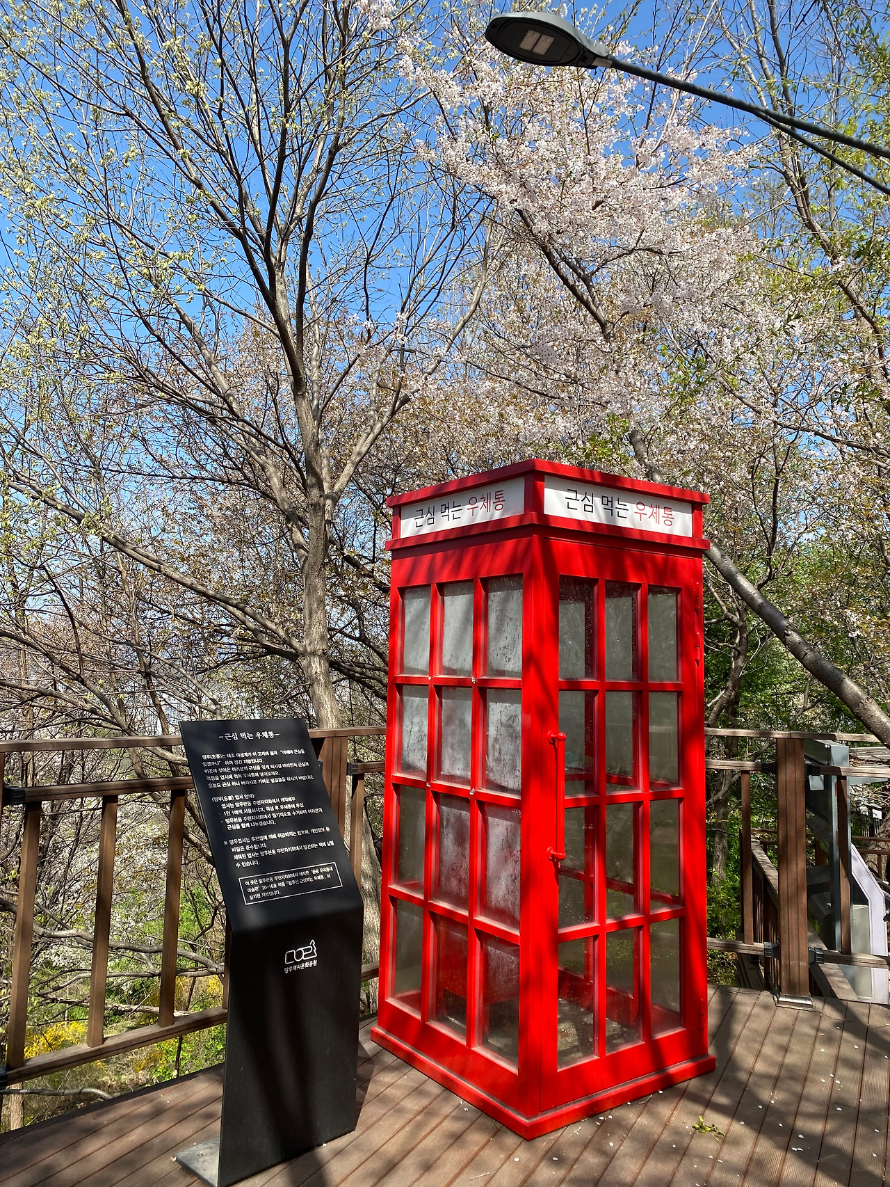 그렇게 전망대까지 가니 딱 뛰어서 30분 거리였다. 잠시 쉬다가 내려가는 길을 다시 뛰기 시작했다. 이런 언덕길 러닝도 처음이니만큼 내리막길 러닝도 처음이었다. 내리막길이라고 좋을 것 같지만, 무릎이 신경 쓰여서 더욱 조심히 뛰었다. 둘레길을 지나 공원아래까지 내려오니 올라오면서는 보지 못했던 ‘근심 먹는 우체통’이 있다. 느린 우체통은 많이 봤지만, 근심 먹는 우체통이 라니. 너무 귀엽고 기발하다. 빨간 부스 안으로 들어갔다. 엽서와 펜이 있다. 뭐라도 써볼까 펜을 집어 들었는데, 딱히 근심이 있지는 않다. 그냥 펜을 내려놓고 다음에 근심이 있을 때 다시 와야지 마음먹는다. 이렇게 근심이 있을 때 올 수 있는 곳이 있는 것만으로도 조금 마음이 든든해지는 기분이다. 그리고 공원을 빠져나와 집 방향으로 계속해서 뛴다. 그러다가 냉동 감자빵을 파는 가게 가 눈에 보여서 잠시 또 멈춰 들어간다. 냉동 감자빵을 하나 구입하니 사장님이 묻는다. “집까지 얼마나 걸리세요?” 아마도 냉동팩을 넣어야 할지 물어보시는 것 같다. “10분 정도 걸려요. 뛰어서” 마지막에 ‘뛰어서’라는 말에 사장님이 빵 터지셨다. 내가 달리는 중이라고 생각을 못하셨던 것 같다. “아, 저 지금 뛰고 있었거든요. 그냥 가지고 가면 될 것 같아요.” 뛰어다니니 환경도 보호하게 되고, 역시 달리기는 좋은 운동이야 하고 생각한다.