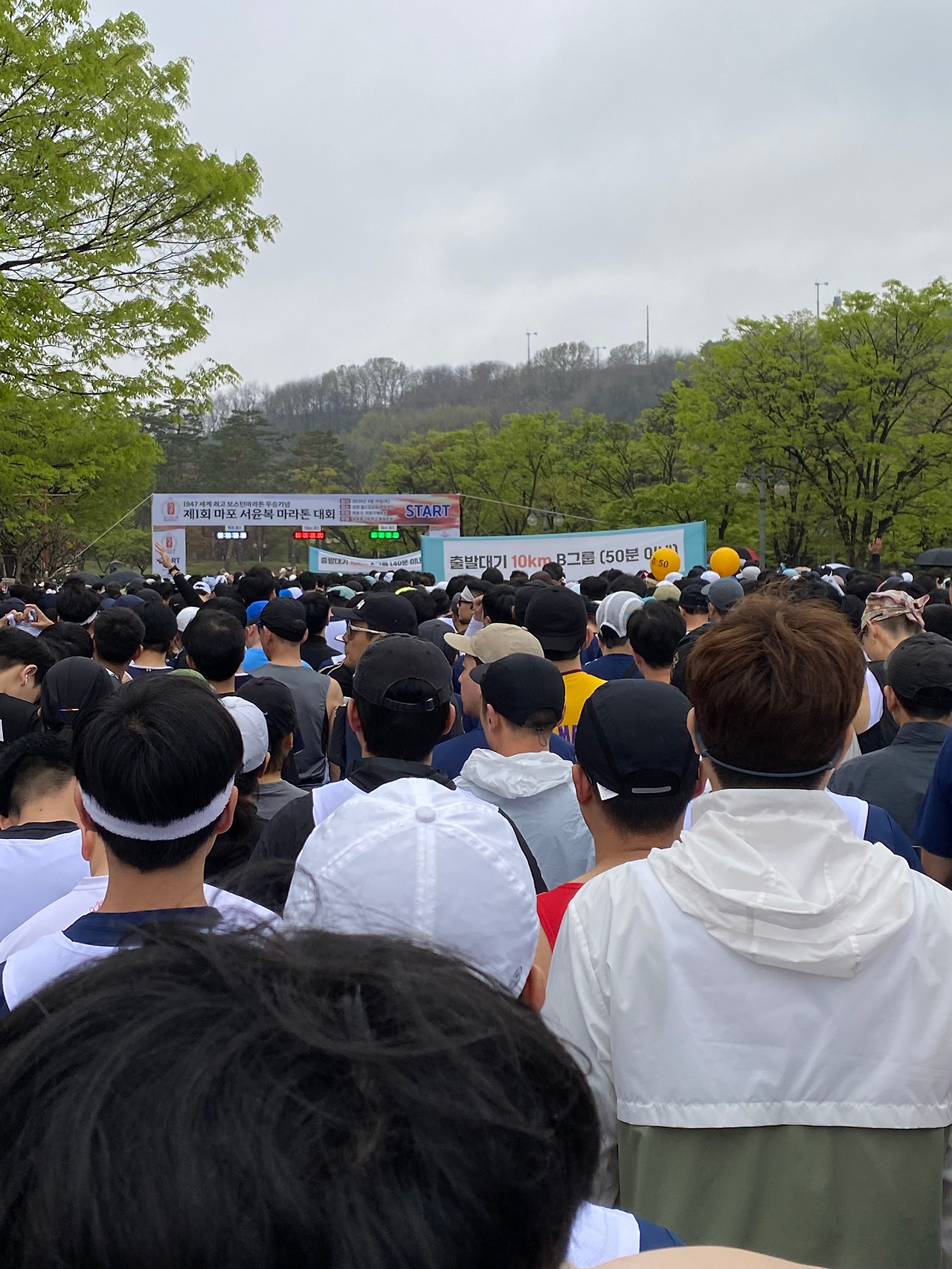 대회 2시간 전에는 식사를 마쳐야 한다는 말에, 일어나자마자 아직 정신도 덜 깬 상태에서 감자빵과 바나나를 먹고 준비를 시작했다. 올림픽공원역에서 친구와 만나서 나오니 비가 부슬부슬 오고 있었지만, 다행히 많은 양은 아니어서 전날까지 심했던 미세먼지도 쓸어주고 오히려 좋았다. 도착해서 짐을 맡기고, 웜업 겸 5분 정도를 가볍게 뛰고 난 후 스트레칭을 하고 대기선으로 갔다. 정말 많은 사람들이 있었다. 사람들이 입은 옷이나 차림새를 구경하는 재미도 있었고, 나이 드신 분들도 꽤 보여서 정말 존경스럽다는 생각이 절로 들었다. 앞쪽에는 하프를 뛰는 사람들이 먼저 있었고, 우리는 중간쯤에 자리를 잡고 사진도 찍고 이야기를 하며 기다렸다. 그리고 드디어 우리 차례! 파이팅을 외치며 각자의 페이스로 달리기 시작했다. 다 함께 우르르 뛰니 조금 벅차기도 하고 재미있었다. 올림픽공원에는 개나리들이 만개해 있었고, 비는 계속해서 내렸지만 시원한 정도였다. 중간에 언덕이 잠깐 나왔지만 어렵지 않게 통과를 했다. 도착해서 이어폰을 안 가져온 걸 알고 조금 걱정했는데, 사람들 뛰는 구경도 하고, 주변 경치도 감상하고, 같이 뛰는 사람들 이야기도 조금씩 엿들으며 뛰다 보니 금방 반환점을 돌았다. 중간중간 페이스를 확인했는데 5분 후 반대의 페이스가 계속유지가 되는데 평소에 달리기를 할 때보다 특별히 더 힘들지는 않아서 이런 게 흔히 말하는 ‘대회뽕’이라고 하는 건가? 하고 생각했다.