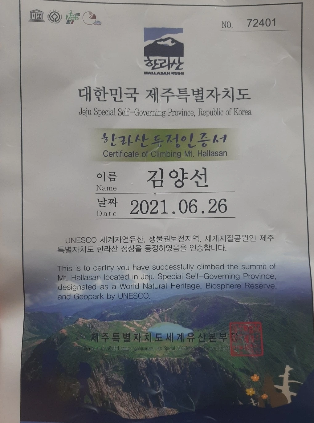 (당황) 그건 잘 모르겠어요. (웃음) 대한민국에 있는 산 중에서는 한라산 해발이 대략 1950m로 가장 높은 산이라고 하더라고요. 설악산, 지리산도 높은데 그 산들보다 한라산이 더 높다고 해요. 어쨌든 그래서 갔다 왔는데 정말 뿌듯하긴 하더라고요. 우리나라에서 가장 높은 산의 정상에 올랐다는 그런 뿌듯함!