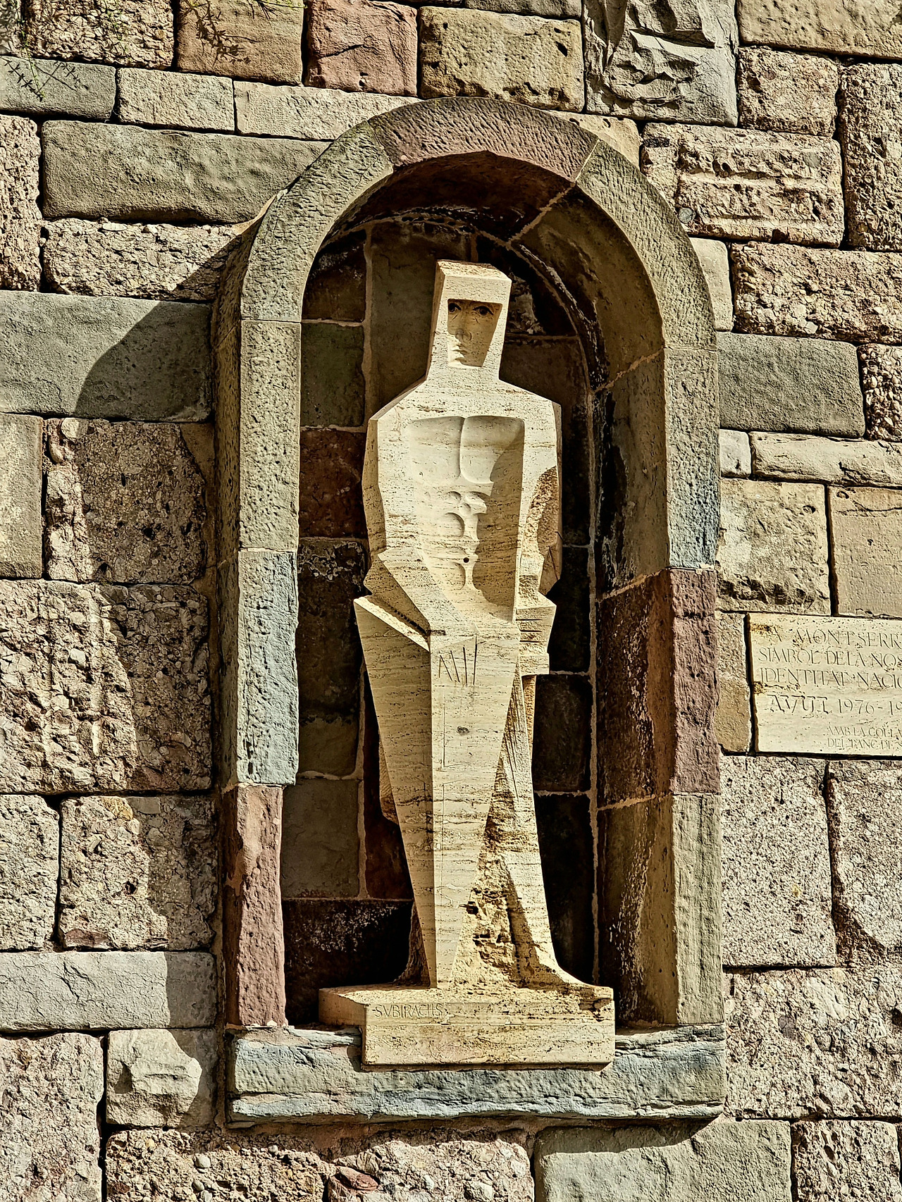 수도원에 들어서면 산 조르디 기사 조각이 여행자들을 맞아준다. 사그라다파밀리아(성가족대성당)의 '수난의 파사드'를 장식한 조셉 마리아 수비라치(Josep Maria Subirachs)의 작품이다. 기사 조각은 양각이 아닌 음각으로 표현돼 있고 전체적으로 직선이 사용돼 딱딱한 느낌을 준다. 인간의 표정과 근육을 세밀하게 표현한 이탈리아 미켈란젤로의 조각과는 대척점에 있다고 해야 할까.