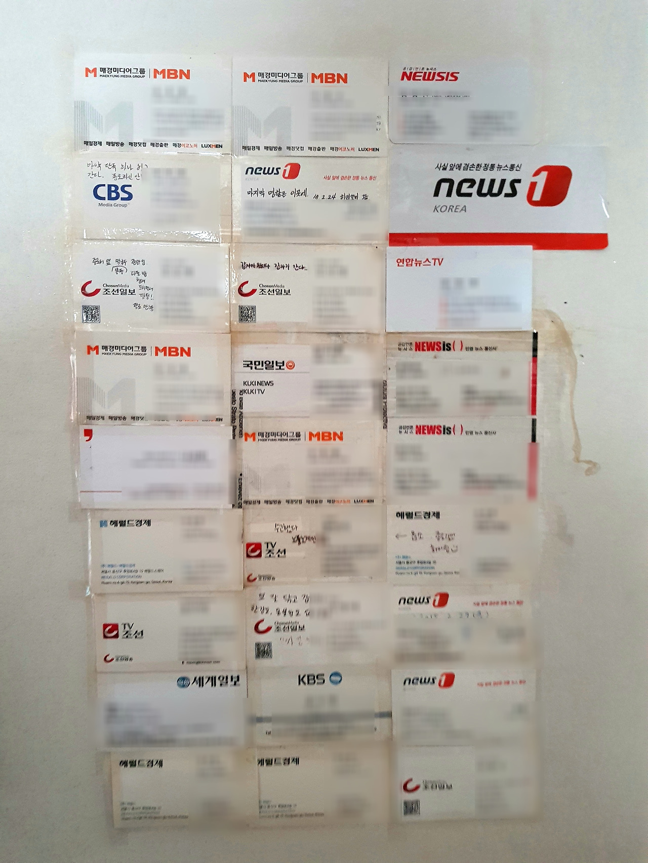 벽면에는 기자실을 거쳐간 수습기자들의 명함이 빼곡하게 붙어있었다. "잊지 못할 XX라인, 먼저 갑니다~" "XX라인 맛집은 여기!" "다 개안타(괜찮다)" "도 잘 닦고 갑니다" 이런 문구들이다. 수습기자를 마치면서 명함을 붙일 수 있는 날이 언제 오려나 싶어 까마득해졌다. 군대에서의 감정을 살면서 다시 느끼게 될 줄 몰랐다.