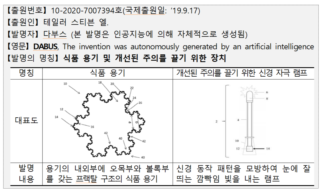 '다부스'라는 AI 프로그램이 '눈꽃 모양이 무한히 반복되는 프랙털 형태의 그릇'과 '신경 동작 패턴을 모방해 눈에 잘 띄는 램프'를 발명했다. (개인적으론 이 두 상품이 특허권을 받을 정도의 고도한 발명인 지는 잘 모르겠으나, 이는 별개의 논점이다.)