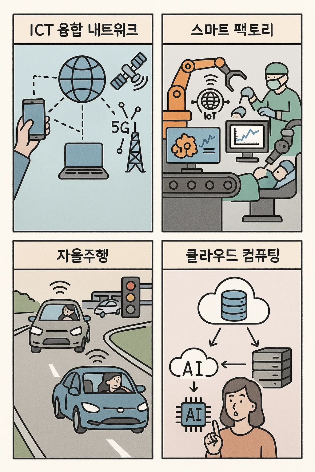 정보통신기술(ICT) 융합 네트워크는 새로운 사회적·경제적 패러다임을 형성한다. 유무선 통신이 융합되고 위성 네트워크와 5G, 6G 기술이 접목되면서 어디서든 안정적인 데이터 전송이 가능해졌다. 물류, 금융, 의료, 교육 등 다양한 산업에서 인간의 개입을 최소화하고 있다. 스마트팩토리는 AI와 사물인터넷(IoT) 네트워크를 통해 데이터를 실시간 분석하고 생산 관리를 자동화한다. 의료 분야에서도 실시간 원격 수술이 가능해지고 있다.