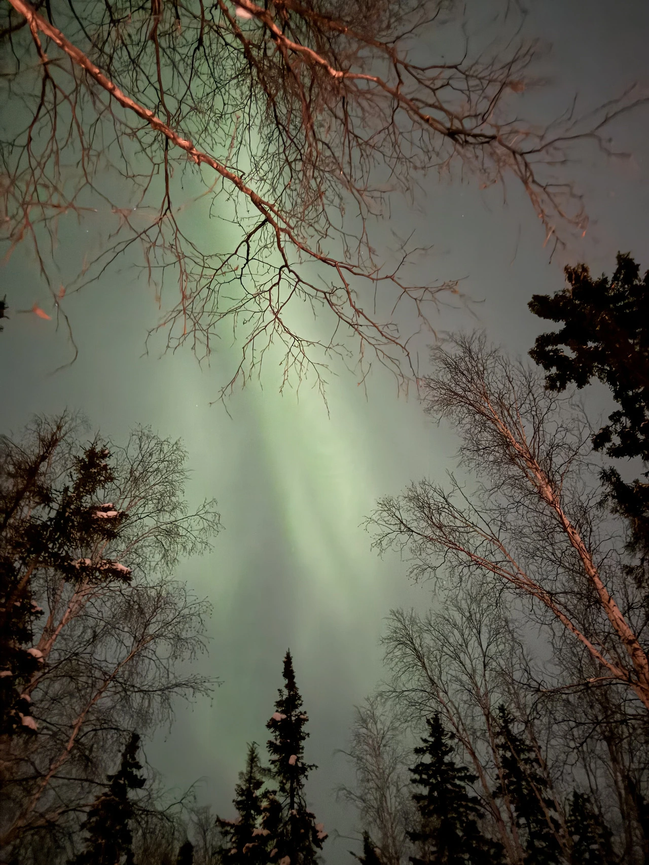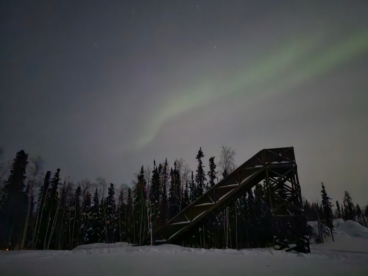 오로라는 마치 연녹색의 실크 원단이 살랑거리는 느낌이었다. 흔히 상상하던 선명하고 쨍한 느낌은 아니었다. 아마도 오로라와 땅 사이에 눈구름의 막이 껴있기 때문이었을 것이다.