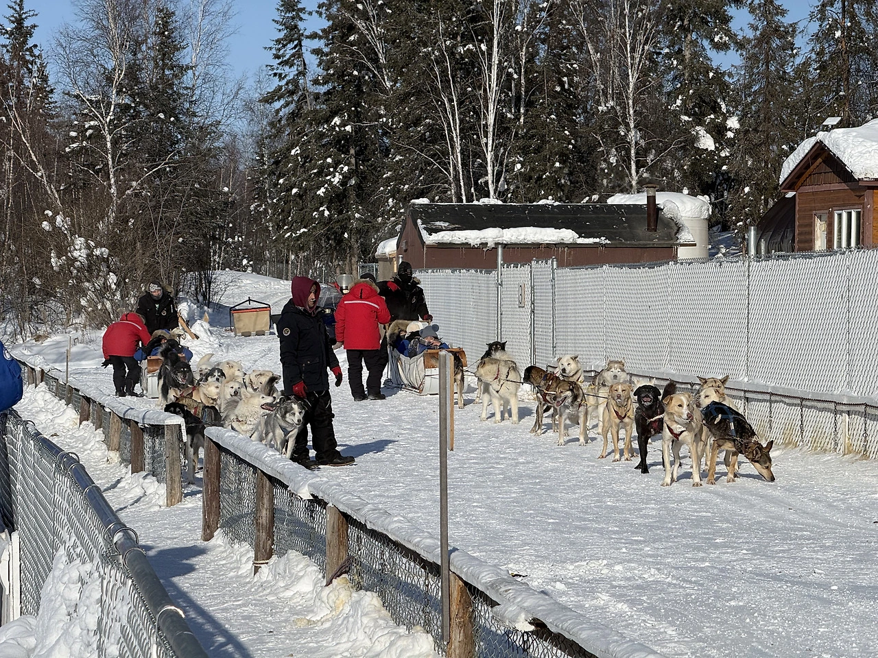 오로라빌리지에선 개썰매를 체험할 수 있다. 시베리안허스키 등 대형견들이 끄는 썰매를 타고 오로라빌리지 주변을 한 바퀴 도는 프로그램이다. 하나의 썰매를 열댓 마리의 개가 끈다. 선두는 가장 똑똑한 개가 맡는다. 후방은 힘이 좋은 개다. 이 정도 숫자라면 개들에게 별로 힘이 들 것 같지는 않았다.