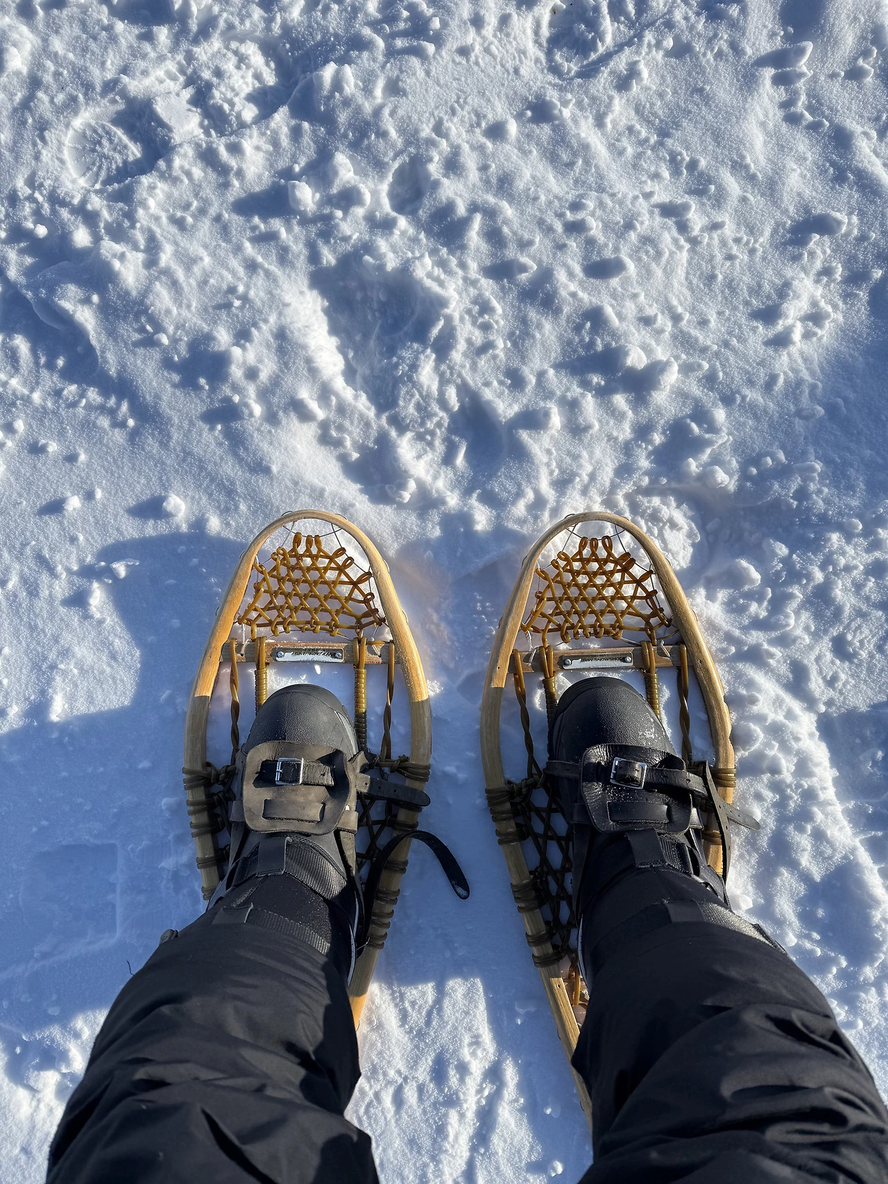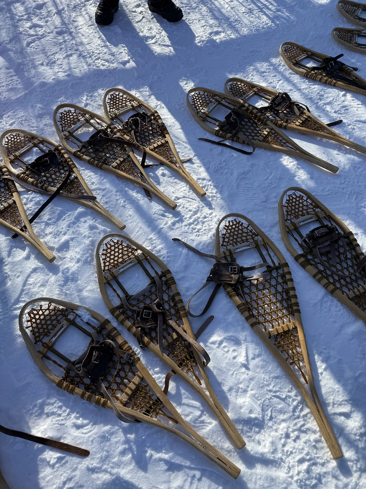 그다음 프로그램은 스노슈잉(snowshoeing)이다. 눈에서 걸을 수 있도록 만든 스노슈즈를 신고 오로라빌리지 주변을 산책한다. 스노슈즈는 흡사 테니스 라켓처럼 생겼다. 넓은 틀이 눈 위에서 사람의 체중을 분산시켜서 덜 미끄러지도록 한다. 그렇다고 아예 미끄러지지 않는 것은 아니다. 보다 효과적으로 걷기 위해 지팡이를 하나씩 들고 다녔다.