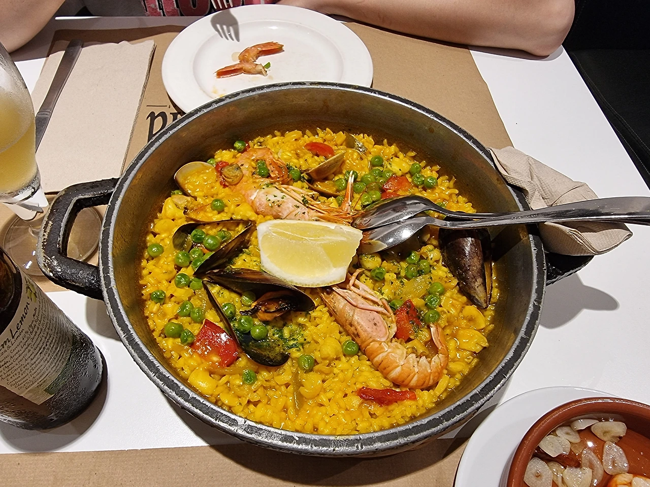 바르셀로나에서의 첫 식사는 'Santa Anna'라는 타파스 바에서 먹었다. 우리는 해물 빠에야(일종의 볶음밥)와 새우 감바스 그리고 레몬 맥주를 시켰다. 빠에야는 소금 간이 좀 셌지만 먹을 만한 정도였다. 우리나라 볶음밥처럼 기름진 느낌은 아니다. 고슬고슬하니 담백한 것 같으면서도 짭조름하다고 해야 할까. 감바스는 가격에 비해 양과 질이 매우 우수했다. 역시 타파스의 나라다. 음식들이 싱그러운 맛의 레몬 맥주와 궁합이 잘 맞는다. 이렇게 먹었는데 가격은 32.60유로. 우리나라 돈으로 4만5000원 정도다. 우리나라보다 물가가 살짝 싼 느낌이다.