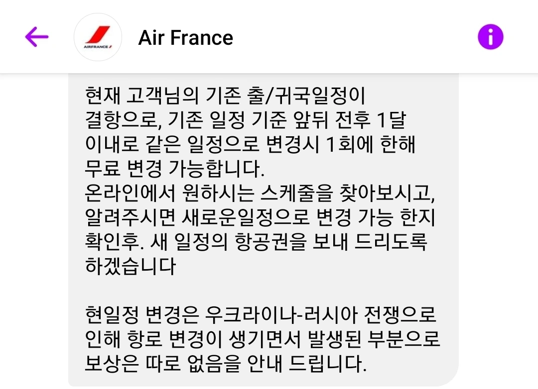 한 5월 중순쯤 됐을까. 아무 생각 없이 메일함을 열었더니 한 달 전쯤 에어프랑스에서 'Important'라는 제목으로 보낸 메일을 발견했다. 코로나19와 러시아 영공 우회 등의 상황 때문에 항공 일정이 토요일 새벽 2시25분 인천 출발, 그다음 토요일 저녁 6시 인천 도착으로 바뀐 거다. 스페인 체류하는 시간은 크게 달라지지 않았지만 환승 대기 시간이 각각 5시간40분, 8시간25분 가량 생겼다.