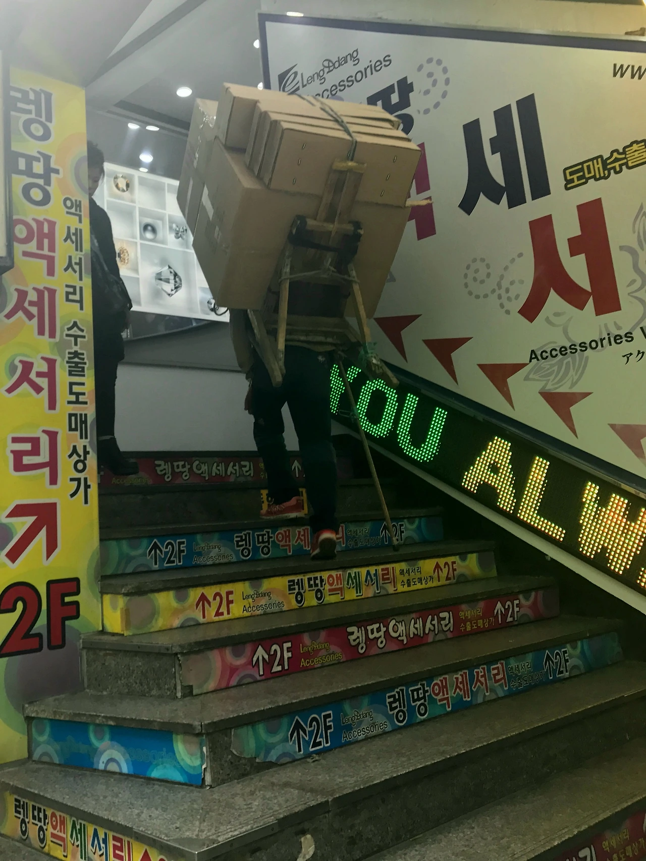 상가 계단을 오르는 지게꾼 / 직접 촬영
