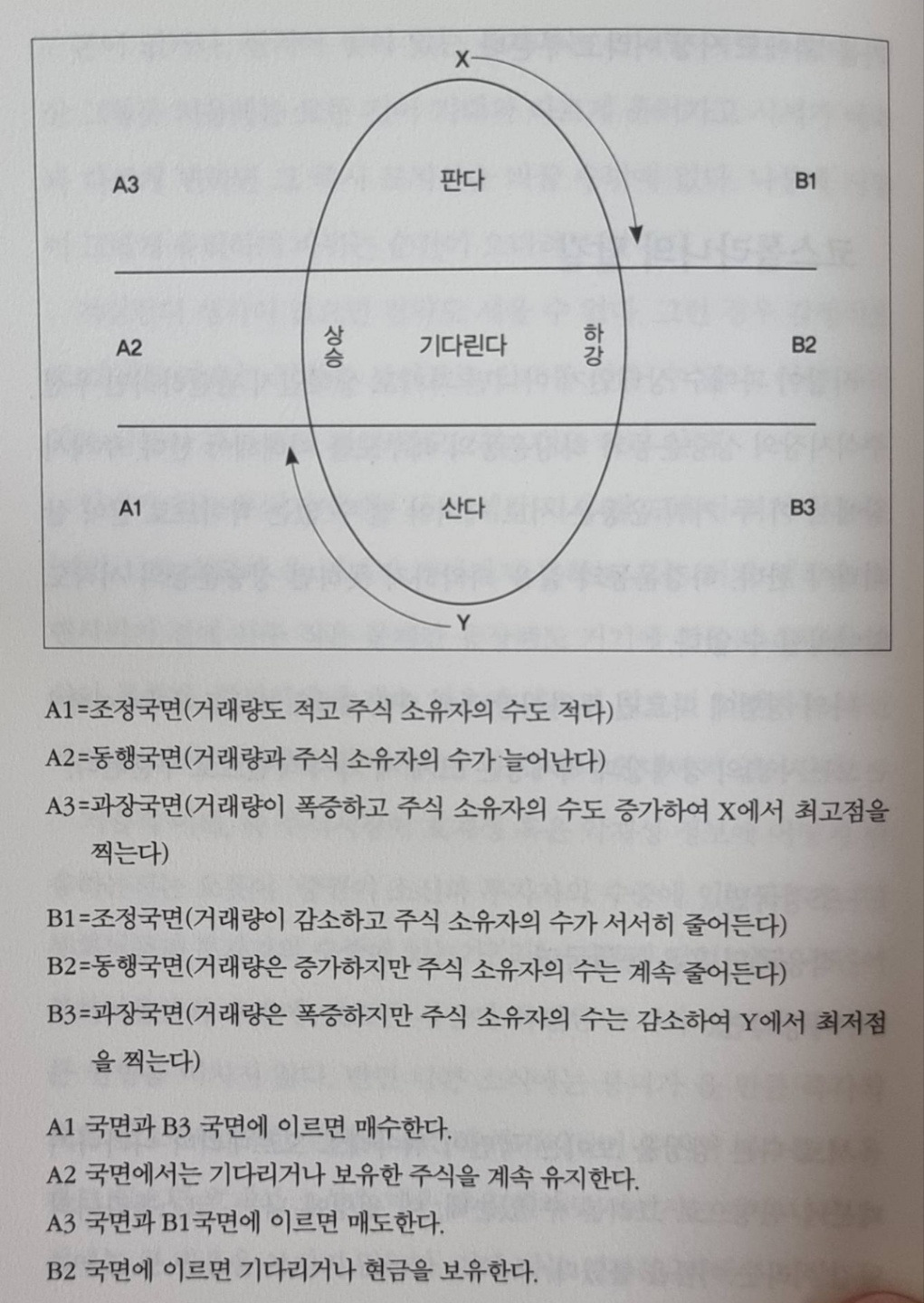 거래량이 많고 주식 소유자가 많아지며 가격이 상승하는 A2국면에선 추이를 지켜볼 것을 권한다. 그러다가 A3 국면에 접어들었을 때 미련 없이 주식을 팔아치우라는 것이다.